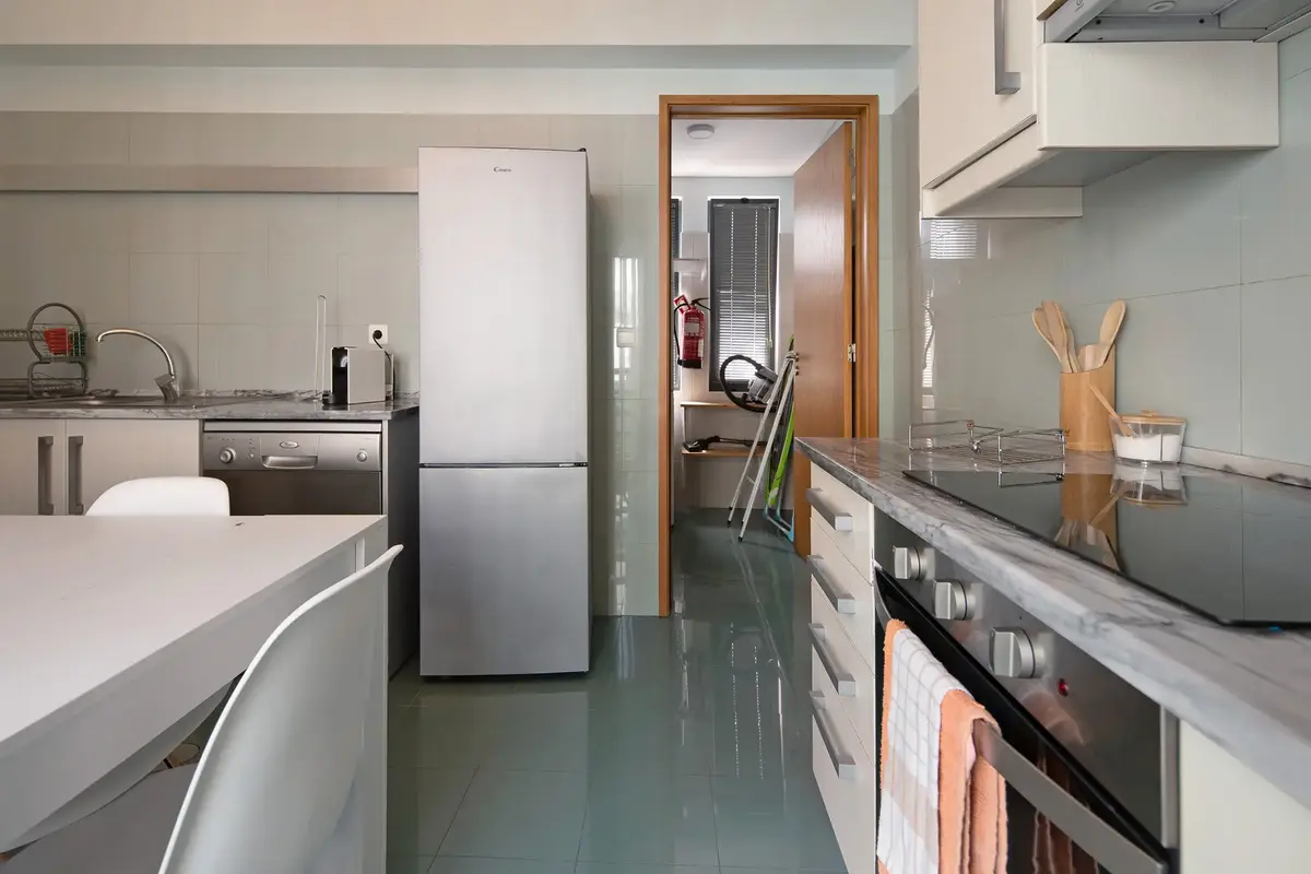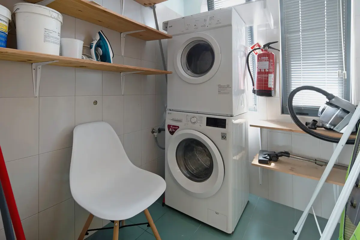 Adjacent to the kitchen, you will find a private laundry room equipped with independent washing and drying machines, a steam iron, and a board, making this apartment perfect for long-term stays.